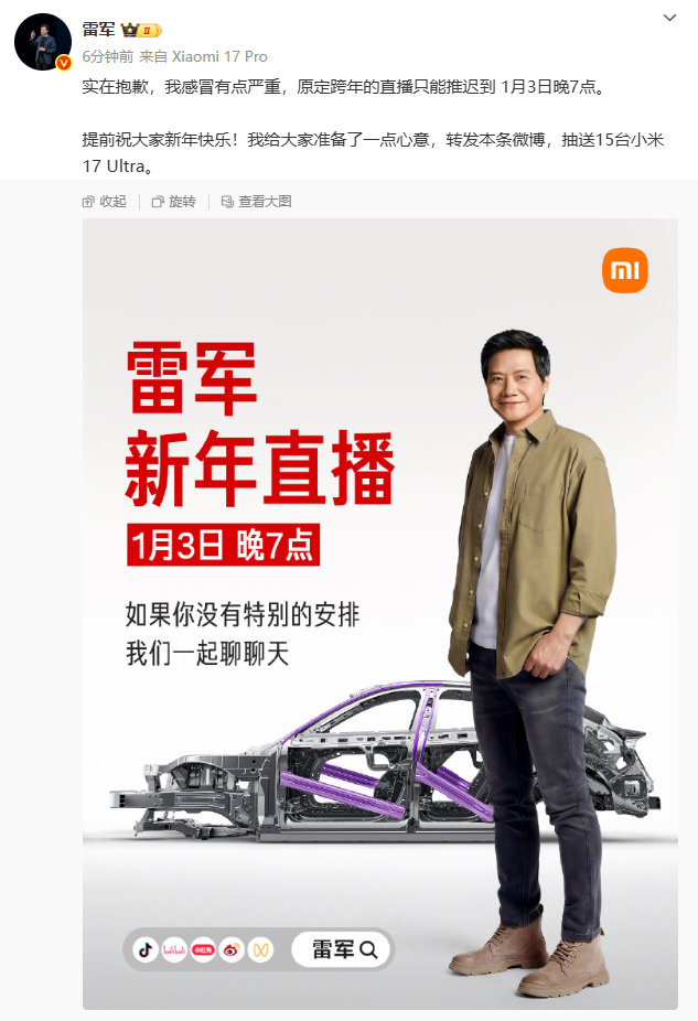 12月31日,小米集团董事长雷军发文称,感冒有点严重,原定今晚的直播推迟到1月3日晚7点。