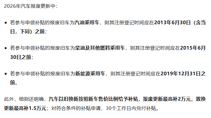 商务部等部门今天(12月31日)发布关于2026年汽车以旧换新补贴实施细则,明确参与申领2026年汽车报废更新补贴旧车的注册登记时间,相比2025年进一步扩大支持范围。