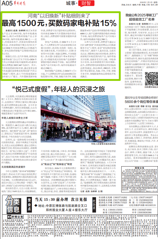 购买6类家电产品立享15%补贴,每件补贴最高1500元;购买4类数码智能产品立享15%补贴,每件补贴最高500元……近日,河南省商务厅、河南省发展和改革委员会、河南省财政厅联合发布《关于启动2026年河南省消费品以旧换新汽车、家电及数码智能产品领域补贴活动的公告》。