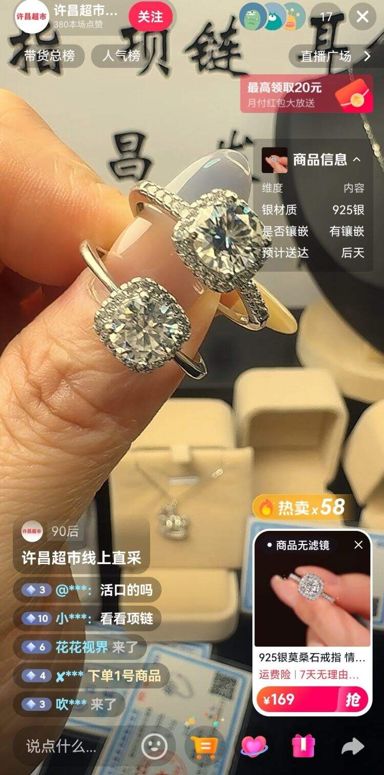 在抖音平台,不少标注“许昌超市代购”的商家依然再售小方糖戒指,一卖家号称该款戒指虽然已经在胖东来下架,但是前期囤货较多,依然是胖东来的产品、值得信任。