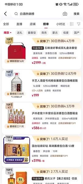 在抖音商城的白酒销售榜单里,五粮液好事成双礼盒浓香型30日热销4.4万件;手艺人酒壹号纯粮食酱香型白酒30天热销12.8万件;泸州老窖六年窖珍品浓香型白酒30天热销4.3万件。