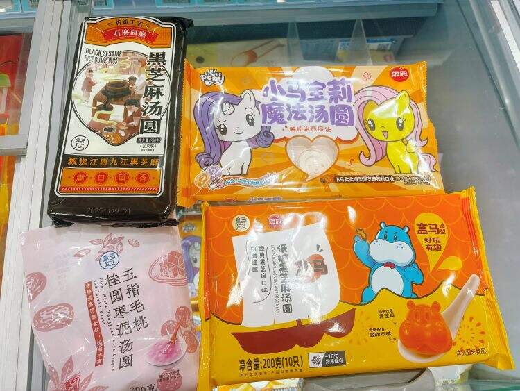 冷藏架上,小马宝莉、“蛋仔派对”等IP款吸引着年轻群体与亲子家庭;河马造型低糖汤圆憨态可掬;另一侧,“五指毛桃桂圆枣泥”等产品将“养生”理念印入包装,转化传统食补为现代点心。