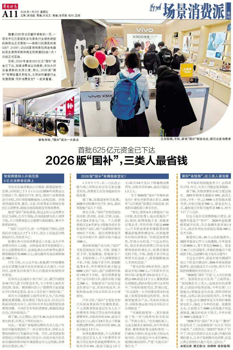 为优化实施消费品以旧换新,根据国家统一安排,河南省已于1月1日启动2026年消费品以旧换新工作,继续对汽车、家电、数码产品等领域进行补贴,同时将智能眼镜纳入补贴范围。河南省将围绕零售、餐饮、文旅、住宿等重点领域发放2亿元消费券,鼓励各地因地制宜发放消费券。