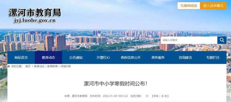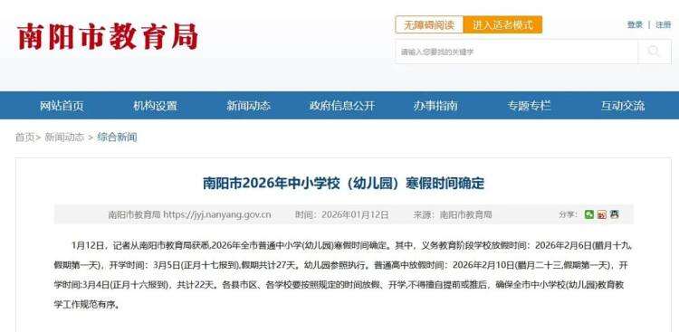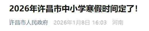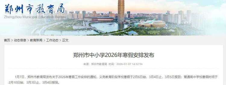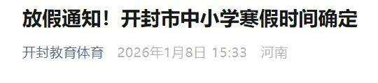 1月12日,记者从河南省内多地教育部门汇总获悉,目前,河南省内已通知寒假放假时间的市有:郑州、洛阳、许昌、漯河、濮阳、信阳、焦作、开封、商丘、济源、平顶山、鹤壁、周口、安阳、南阳等15市已相继发布2026年中小学寒假放假安排,明确义务教育阶段和普通高中将分时段开启寒假↓