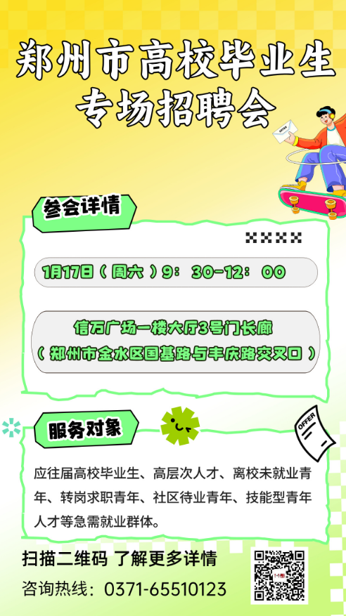 郑州市高校毕业生专场招聘会将于1月17日(周六)上午9时30分至12时在郑州金水信万广场一楼长廊大厅(3号门入场)举行,提供9600余个优质就业岗位。
