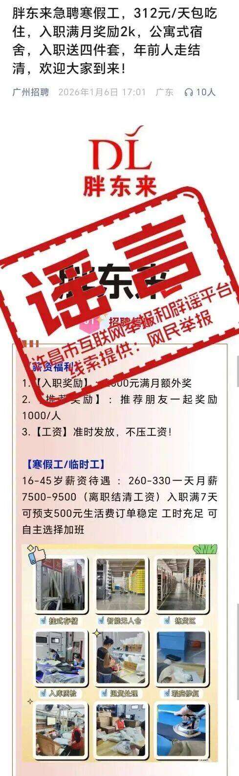近日,某平台账号“广州招聘”发布信息“胖东来急聘寒假工,312元/天包吃住,入职满月奖励2000,公寓式宿舍,入职送四件套,年前人走结清”。经核实,许昌市胖东来商贸集团有限公司近期无此招聘计划,网传信息为谣言。