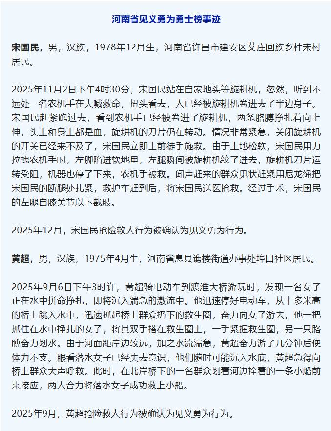 1月12日,中央政法委在京发布2025年第四季度见义勇为勇士榜。根据见义勇为典型的网络关注度、各地依法确认和申报意见,进行综合评审评议,共有50位见义勇为勇士获通报表扬和奖励慰问。其中,河南两人入选,分别是宋国民和黄超。