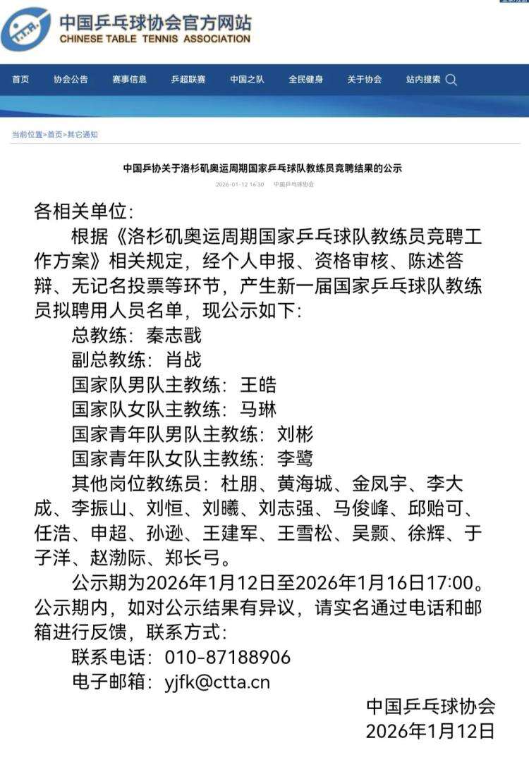 中国乒协官网12日公示洛杉矶奥运周期国家乒乓球队教练员竞聘结果,拟聘秦志戬为总教练、肖战为副总教练、王皓为男队主教练、马琳为女队主教练。