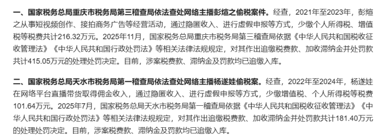 1月14日,重庆、甘肃两地税务部门曝光近几年依法查处的2起网络主播偷税案件。其中,网络主播彭煊之、网络主播杨遂娃少缴个人所得税、增值税等税费分别为216.32万元、101.64万元。