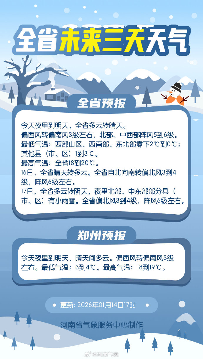 据河南气象,明天,全省最高气温为18℃到20℃。今天夜里到明天,河南大部风力将逐渐增大,偏西风转偏南风3级左右,其中北部、中西部阵风可达5到6级。从周五凌晨开始,全省自北向南将逐步刮起3到4级的偏北风,河南的气温“跳水”正式开启!其中最高气温的下降尤为突出,大部地区将由周四的15℃+持续下跌,从下周一开始,冰点以下的严寒将贯穿全天,并一直持续到下周中段。