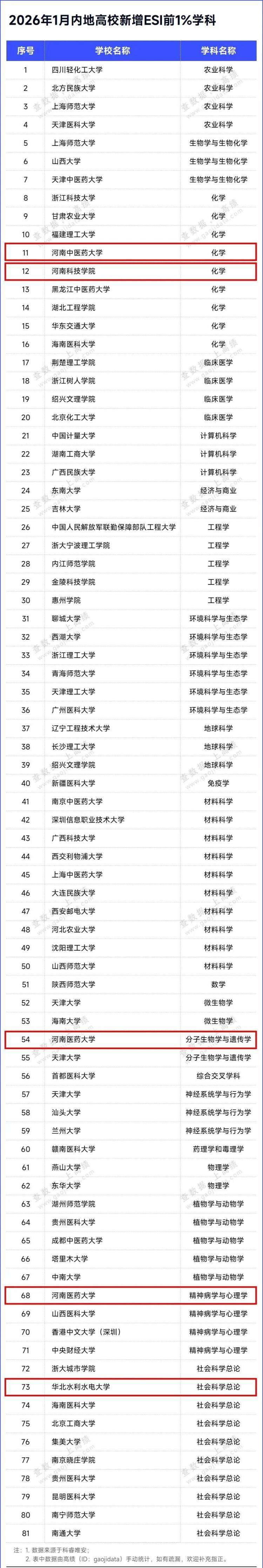 近日,科睿唯安(Clarivate Analytics)公布2026年1月ESI最新排名,河南中医药大学化学,河南科技学院化学,河南医药大学分子生物和遗传学、精神病学与心理学,华北水利水电大学社会科学总论新晋全球前1%学科。