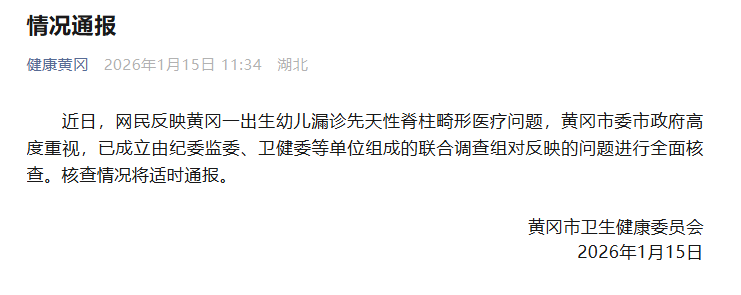近日,湖北黄冈一宝妈称产检未见异常,孩子出生后却查出畸形。黄冈市卫健委15日发布情况通报:市委市政府高度重视,已成立联合调查组进行全面核查。