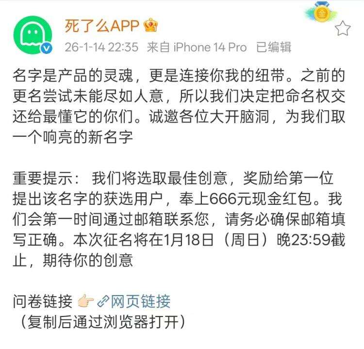 1月14日晚,死了么APP发文:名字是产品的灵魂,更是连接你我的纽带。之前的更名尝试未能尽如人意,所以我们决定把命名权交还给最懂它的你们。诚邀各位大开脑洞,为我们取一个响亮的新名字。