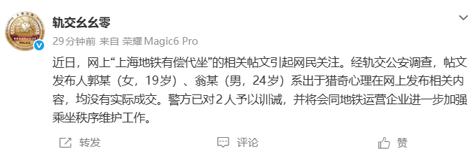 1月15日,上海警方通报“地铁有偿代坐”:郭某(女,19岁)、翁某(男,24岁)两人出于猎奇心理发布“地铁有偿代坐”信息,均未实际成交,已予以训诫。