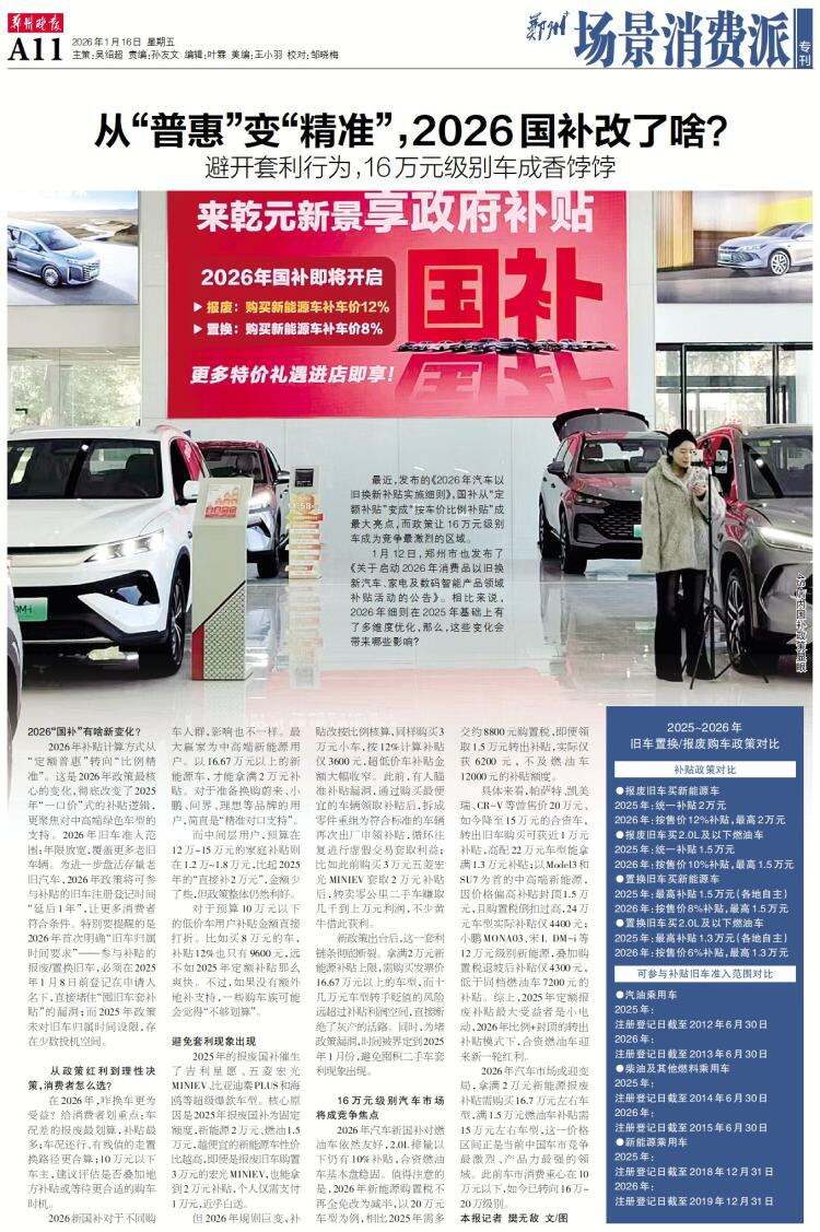 1月12日,郑州市也发布了《关于启动2026年消费品以旧换新汽车、家电及数码智能产品领域补贴活动的公告》。相比来说,2026年细则在2025年基础上有了多维度优化,那么,这些变化会带来哪些影响?