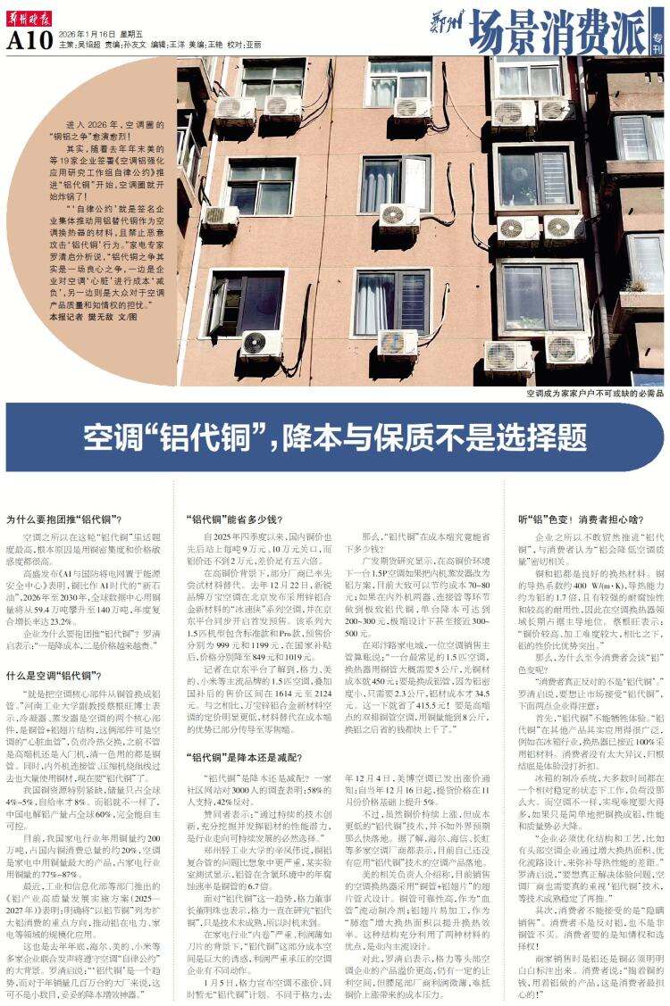 这也是去年年底,海尔、美的、小米等多家企业联合发声将遵守空调“自律公约”的大背景。罗清启说:“‘铝代铜’是一个趋势,而对于年销量几百万台的大厂来说,这可不是小数目,妥妥的降本增效神器。”