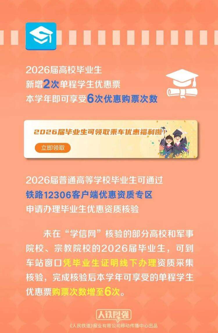 2026年春运火车票即将开始发售,针对学生票的优惠16日国铁集团联合教育部、人力资源社会保障部等多部门出台新规:2026届高校毕业生新增2次单程学生优惠票,本学年即可享受6次优惠购票次数,方便学生前往异地求职。