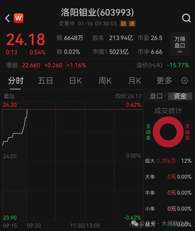 1月16日,洛阳钼业股价开盘即拉升,总市值突破5000亿元大关。