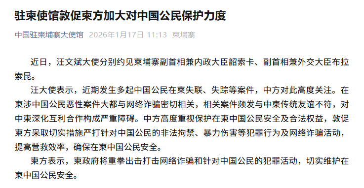 近期发生多起中国公民在柬失联、失踪等案件,1月17日,中国驻柬埔寨大使馆发文,敦促柬方严打针对中国公民的非法拘禁、暴力伤害及网络诈骗活动,确保在柬中国公民安全。