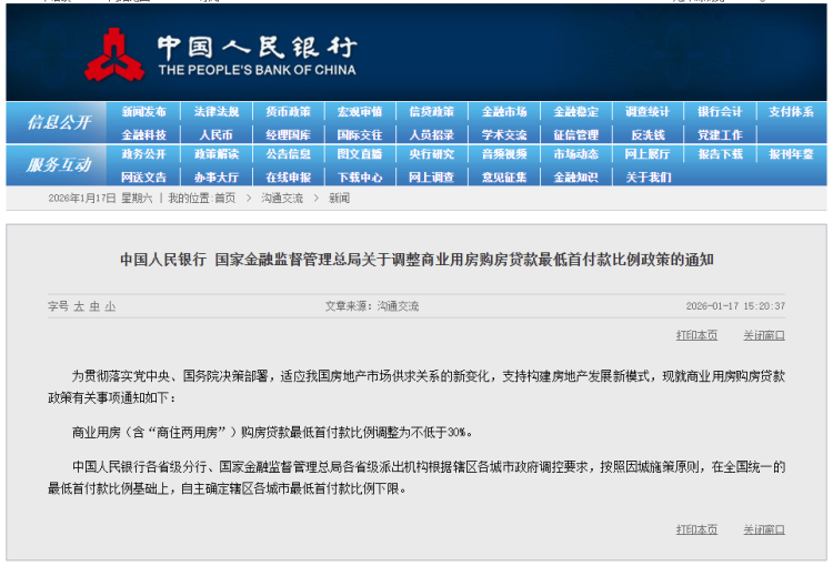 中国人民银行、国家金融监督管理总局1月17日联合发布通知称,商业用房(含“商住两用房”)购房贷款最低首付款比例调整为不低于30%。