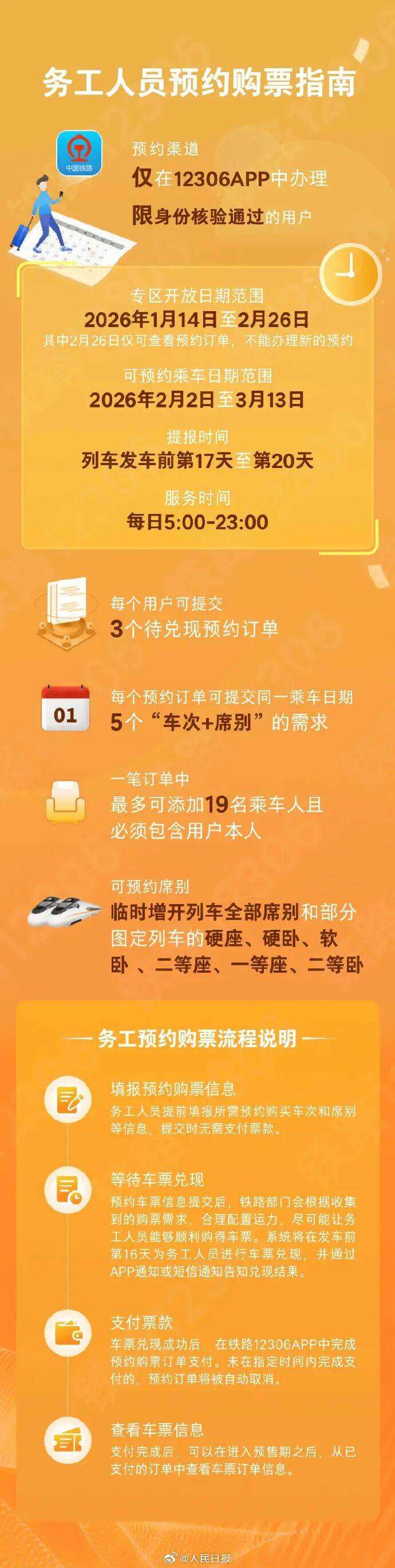日前,铁路12306手机客户端务工人员预约购票服务上线,符合条件的务工人员可通过专区预约购买2026年春运期间往返车票,将有力保障重点群体旅客春运出行。详戳↓