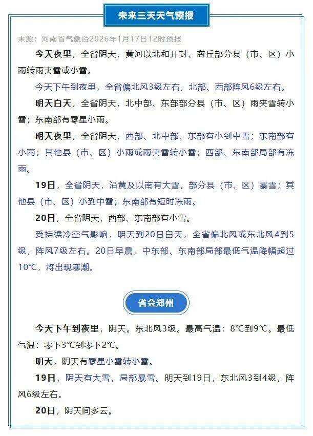河南省疾控局、河南省气象局1月17日12时联合发布低温健康风险提示:18日至23日,河南将遇低温雨雪冰冻天气,18日夜里至20日,全省大部降雪,19日为主要时段,沿黄及以南有大雪、部分地区暴雪,局部有冻雨,黄河以南大部积雪8~12厘米,中西部、南部局部可达15~18厘米,其他县(市、区)1~5厘米。期间全省气温累计降 10℃~15℃,局部16℃~20℃,19日至23日,全省大部最高气温将维持在0℃以下;20日至24日早晨最低气温全省大部-10℃~-6℃,中东部、北部局部达-14℃~-12℃,全省将出现寒潮。其中,郑州18日有零星小雪转小雪,19日大雪,局部暴雪,20日起持续低温。