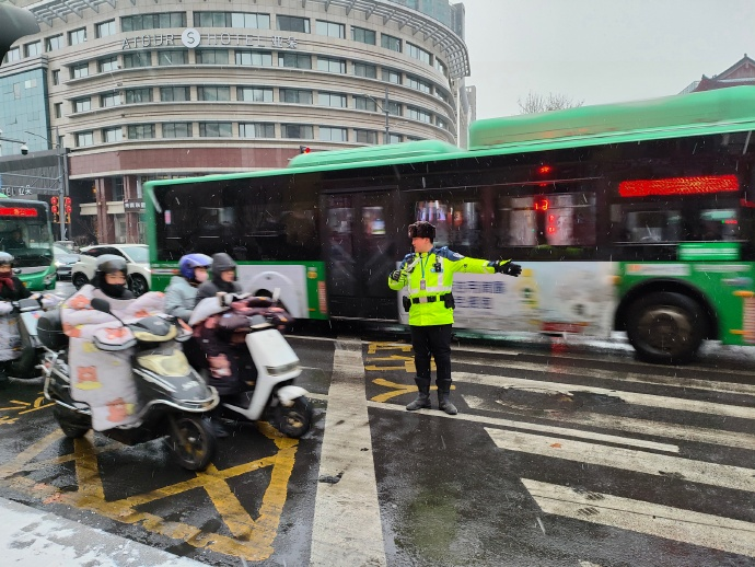 “提前上岗就是为了抢时间,恶劣天气里,我们多跑一步,市民的通行就多一分顺畅和安全。”现场执勤的孙玉强一边吹着哨子疏导车流,一边对记者说。