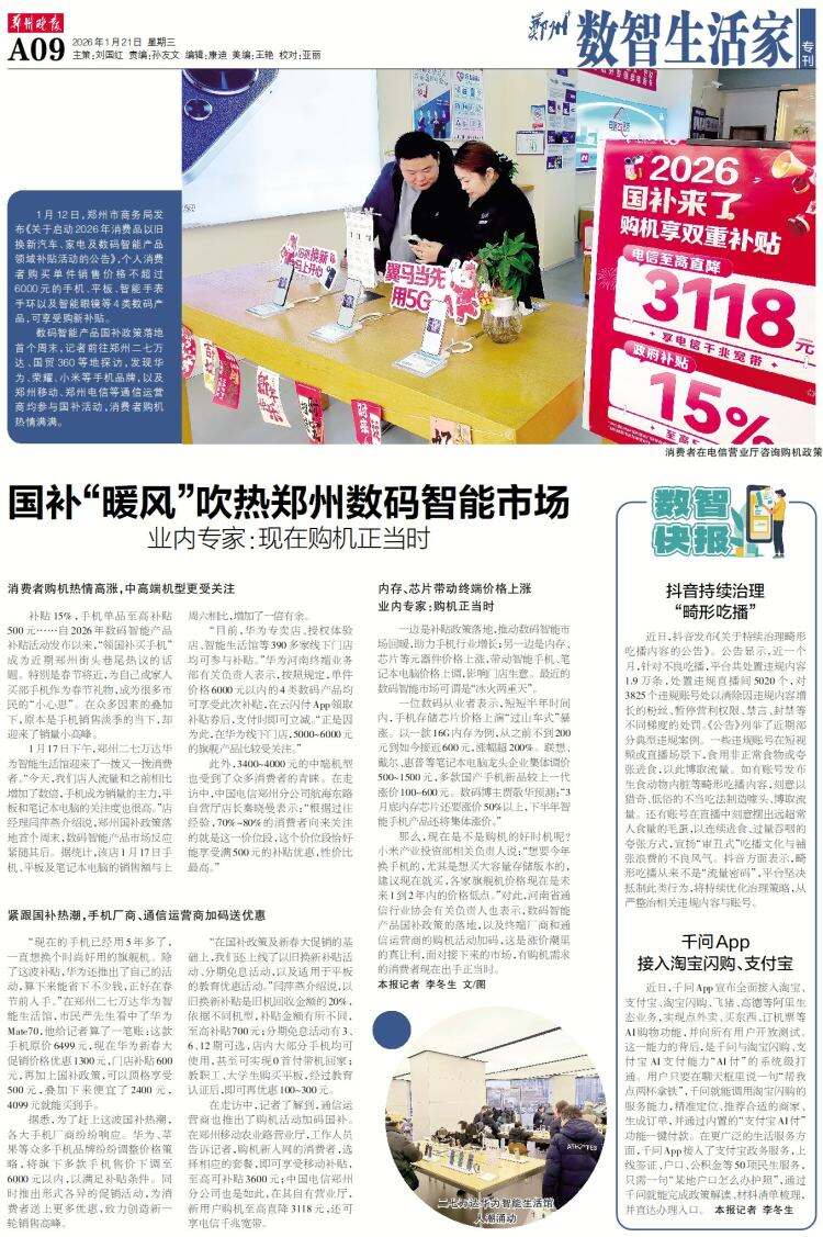 1月12日,郑州市商务局发布《关于启动2026年消费品以旧换新汽车、家电及数码智能产品领域补贴活动的公告》,个人消费者购买单件销售价格不超过6000元的手机、平板、智能手表手环以及智能眼镜等4类数码产品,可享受购新补贴。
