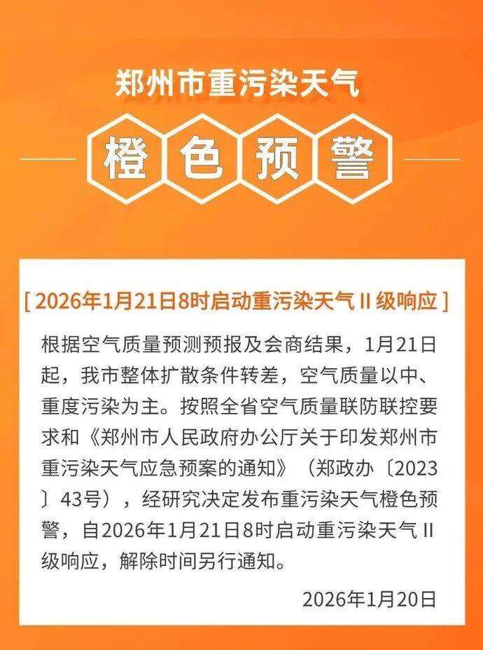 1月21日起,郑州市整体扩散条件转差,空气质量以中、重度污染为主。经研究决定发布重污染天气橙色预警,自2026年1月21日8时启动重污染天气Ⅱ级响应,解除时间另行通知。
