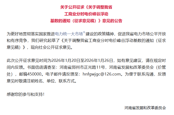 1月20日,河南省发展改革委发布《关于调整我省工商业分时电价峰谷浮动基数的通知(征求意见稿)》,向社会公开征求意见,时间为1月20日至26日。其中明确,直接参与电力市场交易的用户不再执行工商业分时电价;自通知印发次月起,电网企业代理购电用户执行该电价时,输配电价不再参与峰谷浮动。其余事宜按2024年283号文执行。