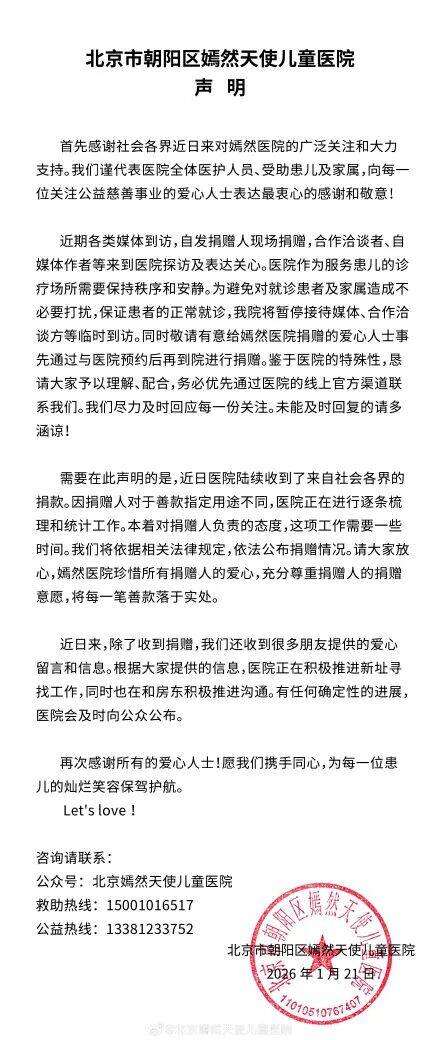 1月21日,嫣然天使儿童医院发布声明称:正在寻找新址,也在和房东积极沟通;暂停接待临时到访,到院捐赠需先预约,将依法公布捐赠情况。20日晚,李亚鹏在社交媒体发布视频向大家致谢,称近期直播共提现29万,已全部以网友名义捐赠给嫣然天使儿童医院。