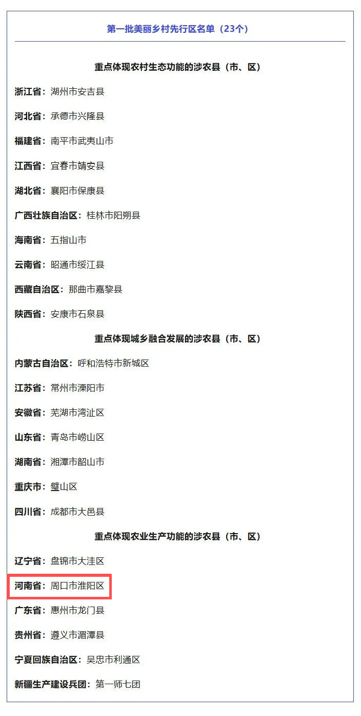 生态环境部今日公布第一批美丽乡村先行区名单,浙江安吉等23个县(市、区)入选。其中,河南省周口市淮阳区入选,成为河南省唯一上榜的县区。