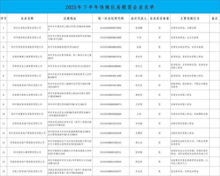 近期,郑州市住房保障和房地产管理局结合2025年下半年全市房屋租赁信访投诉情况,排查出16家住房租赁企业存在严重违规行为,涉及变相克扣租房押金、房屋隔断出租、企业不备案、租赁合同不备案、未按要求开展住房租赁资金监管、推诿投诉调解等问题,严重侵害租客权益。