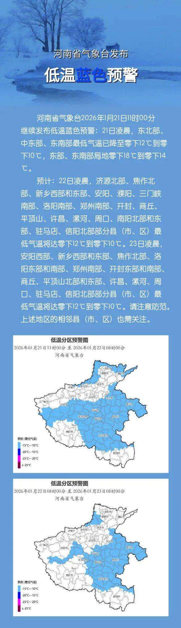 河南省气象台1月21日11时继续发布低温蓝色预警。未来三天我省大部最低气温都在-5℃以下,其中北部、西部、东部、东南部部分县市将达-12℃到-10℃。明天全省大部的最高气温仍在0℃上下徘徊,后天京广线以东回升至2℃到4℃,西部回升至5℃上下。