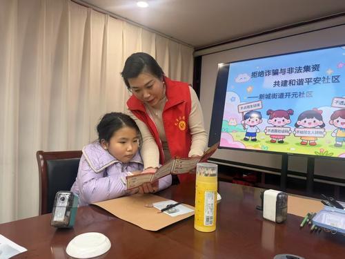 1月21日晚,郑州市惠济区新城街道开元社区在本周的社区绘画课堂开始前,组织开展“拒绝诈骗与非法集资,共建和谐平安社区”亲子志愿服务宣传活动。活动以轻松、互动的方式,让家长和孩子们在参与中学习反诈知识,共同筑牢家庭安全防线。