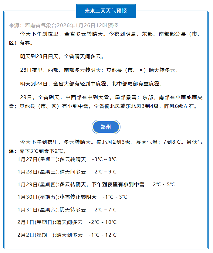 受西南气流和冷空气共同影响,预计29日河南将再迎雨雪天气:中西部有中到大雪,局部暴雪;东部、南部有小雨或雨夹雪;其他县(市、区)有小到中雪。全省偏北风或东北风3到4级,阵风6级左右。预计29日~30日,中西部最高气温将再次下滑至0℃左右!