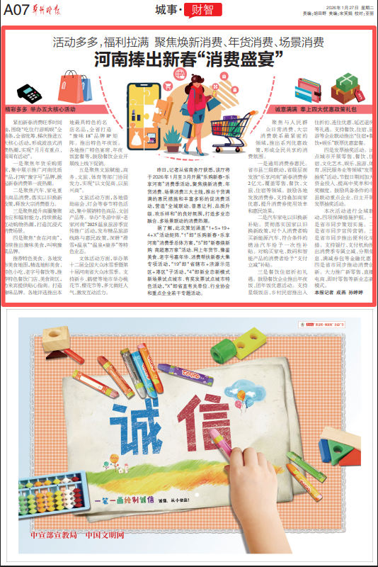 昨日,记者从省商务厅获悉,该厅将于2026年1月至3月开展“乐购新春·乐享河南”消费季活动,聚焦焕新消费、年货消费、场景消费三大主线,推出干货满满的惠民措施和丰富多彩的促消费活动,营造“全域联动、普惠让利、品质升级、欢乐祥和”的良好氛围,打造多业态融合、多场景联动的消费热潮。