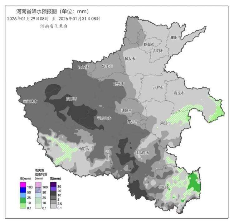 受西南暖湿气流和冷空气共同影响,预计1月29日至30日,河南省将有一次明显降雪天气过程。本轮过程降雪范围广,局部强度大,中西部、南部有中到大雪(3到8毫米),局部暴雪(10到15毫米);其他县(市、区)有小到中雪(1到5毫米)。积雪深度中西部、南部5到8厘米,局部可达10到12厘米,其他县(市、区)1到3厘米。全省偏北风或东北风3到4级,阵风6级左右。全省大部最高气温较前期下降6℃左右。