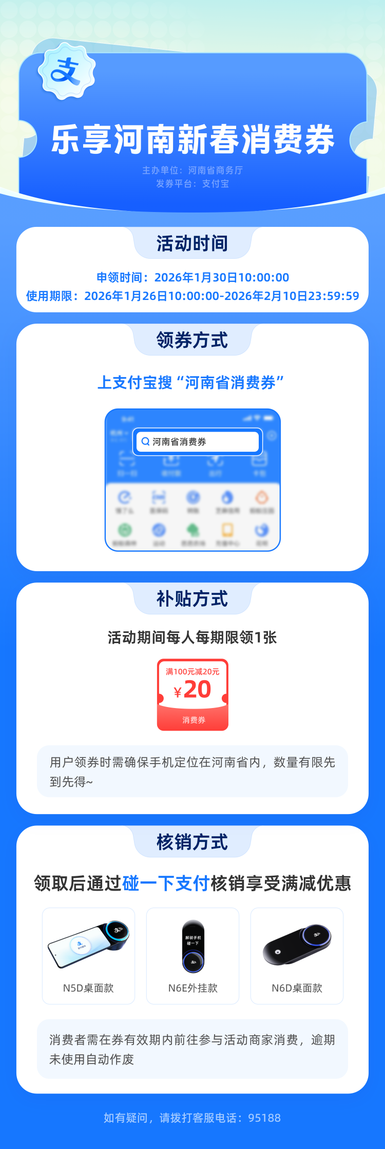 新春添福利,消费更实惠!为推动全省消费市场,1月30日上午10点,河南启动发放“乐享河南”新春消费券:用户上支付宝搜“河南省消费券”提前领券、查询商家,到店消费时使用“碰一下”支付,“满100减20”优惠就能自动核销,还可与商家折扣券叠加使用。