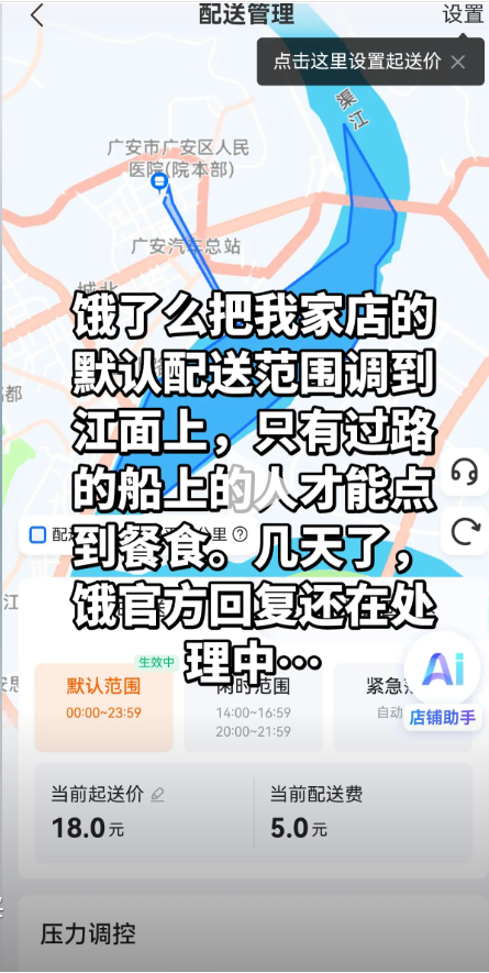四川广安的一家餐饮店“蒸的煮的小食堂”遭遇了令人啼笑皆非的一幕。店主称,因在与淘宝闪购业务经理沟通时,未同意参与其推出的某项活动,随后便疑似遭到“报复”:店铺的配送范围被私自修改,大片陆地区域被删除,核心区域竟变成了当地的渠江江面上。这一改动直接导致店铺在平台上“与世隔绝”,无法接收任何订单。然后,店主将这一遭遇,反映到了社交平台上。