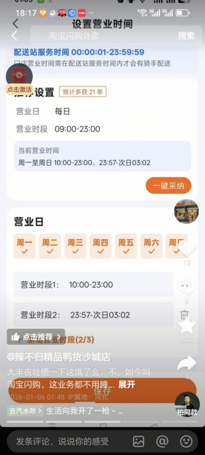 河北张家口“辣不归精品鸭货沙城店”的店主,则经历了一场“深夜惊魂”。其店铺本在夜间23点准时打烊,但近期却多次在深夜被打爆电话。“我们都睡了,骑手电话不停,说是平台有单。惊醒一看,后台显示我们还在营业中!”店主在社交平台无奈吐槽。