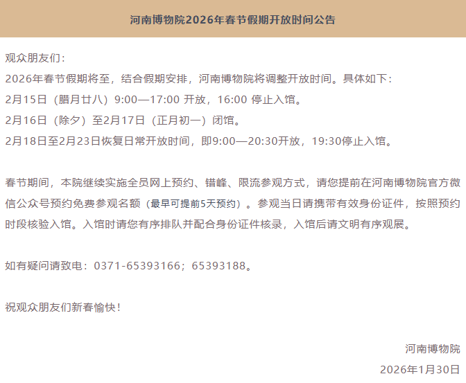 1月30日,河南博物院发布2026年春节假期开放公告。2月15日(腊月廿八)9:00-17:00 开放,16:00 停止入馆。2月16日(除夕)至2月17日(正月初一)闭馆。2月18日至23日恢复日常开放时间。