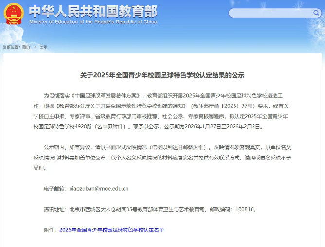 近日,教育部办公厅发布关于2025年度全国青少年校园足球特色学校认定结果的公示,拟认定全国青少年校园足球特色学校4928所,其中,河南435所学校入围公示名单。