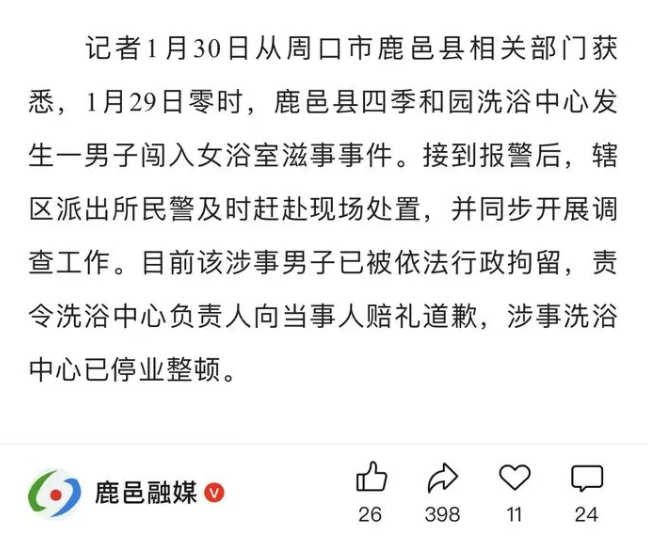周口一男子强闯女澡堂殴打妻子,事发时有8名女性正在洗澡。1月30日,周口鹿邑通报:涉事男子已被行拘,涉事洗浴中心停业整顿。