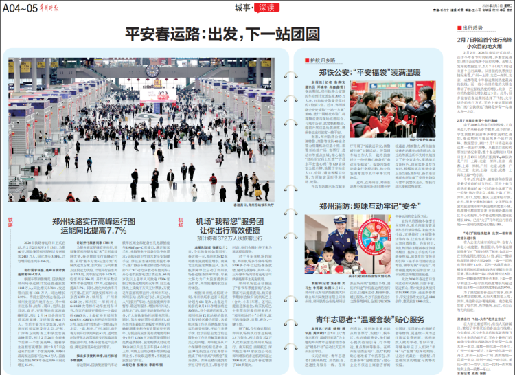 2026年铁路春运昨日正式启动,自2月2日起至3月13日,为期40天,国铁集团郑州局预计发送旅客2443万人,同比增长3.34%,计划增开临客列车356列。