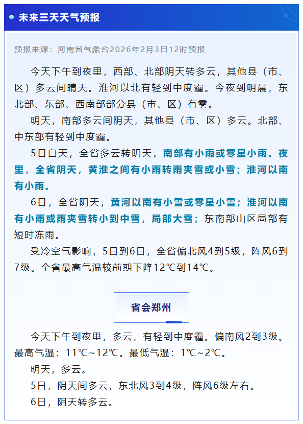 河南大回暖进行中,周三多地最高气温将突破15℃。然而,随着一股实力强劲的冷空气抵达河南,预计6日白天,全省大部的最高气温将跌至不足5℃,信阳、南阳一带将在一天内骤降15℃!最低气温也将同步下探,7日早晨将迎来近期的气温低点,西部、北部等地最低气温将重返-5℃以下,寒意深重。除了气温跳水外,雨雪+大风的经典组合也将一同赶来↓