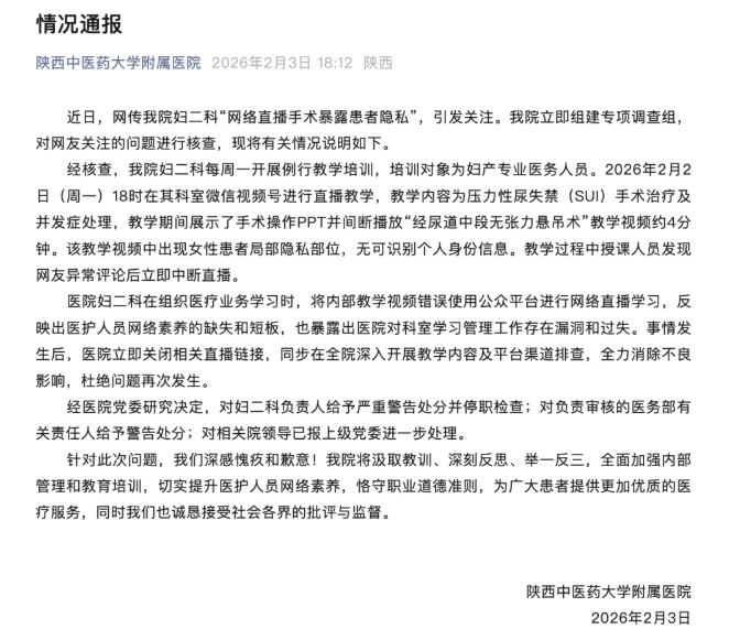 陕西某医院直播“妇科手术”,被指暴露患者隐私部位,高峰期在线人数5万多人,网友集体举报。2月3日,陕西中医药大学附属医院通报“直播暴露患者隐私部位”:深感愧疚和歉意,相关负责人被严重警告并停职。