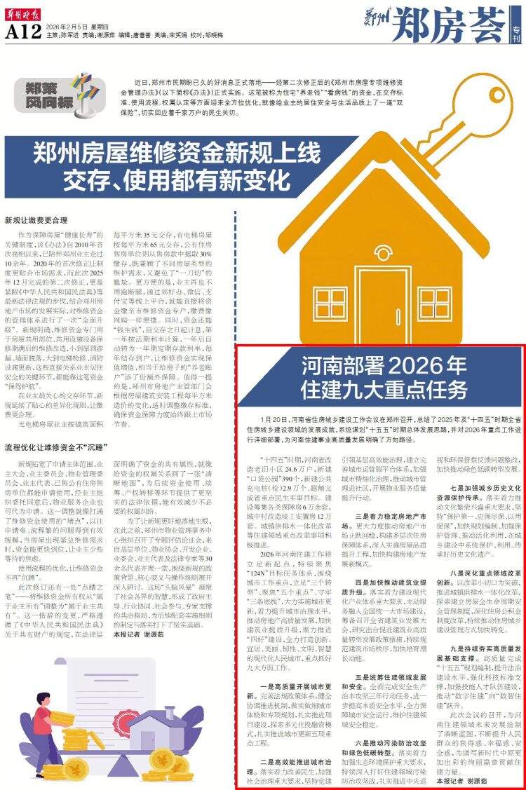 2026年河南住建工作将立足新起点,持续聚焦“124N”目标任务体系,围绕城市工作重点,立足“三个转型”、聚焦“五个重点”、守牢“三条底线”,大力实施城市更新,着力提升城市治理水平,推动房地产高质量发展,加快建筑业提质升级,聚力推进“四好”建设,全力打造创新、宜居、美丽、韧性、文明、智慧的现代化人民城市,重点抓好九大方面工作。