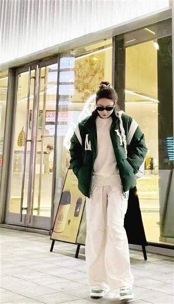 街头常见女生穿搭男女同款的“羽绒服+工装裤+板鞋”