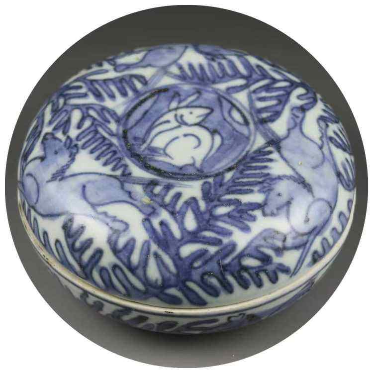 除了陶俑、三彩,马的形象也作为装饰纹样出现在实用瓷器中。郑州瓷源博物馆藏有一件清代青花双骏盘,画面的核心主体两匹马造型生动,一匹昂首嘶鸣,一匹回首张望,体态矫健,布满青花点缀,显得灵动有神。两匹马将“马到成功”“福从天降”等多重吉祥寓意巧妙地融合在一起。在郑州瞻世客家文化博物馆,明代青花海马纹瓷盏、明代青花月兔海马纹瓷盖盒是馆藏的珍品。海马纹,以白马与海水构图,勾勒出白马腾跃于蓝线勾画的起伏不断的海浪之上、踏浪而行的图案。月兔海马纹,以马与海藻构图,勾勒出一幅马在海藻间穿梭的图案,三匹马环绕月兔,既寓意“马到成功、通达四海”的商贸意象,又寄托了客家人对“平安顺遂、福寿绵长”的祈愿。